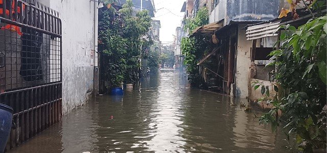 Genangan air yang menyebar ke seluruh permukaan jalan dan halaman rumah warga membuat aktivitas sehari-hari harus terhambat. Rumah warga yang terdiri dari 3 RT ini mengalami air masuk hingga ke dalam ruang tamu dan kamar tidur, membuat barang-barang elektronik seperti televisi, kipas angin, dan mesin cuci terancam rusak jika tidak segera diangkat ke tempat yang lebih tinggi.