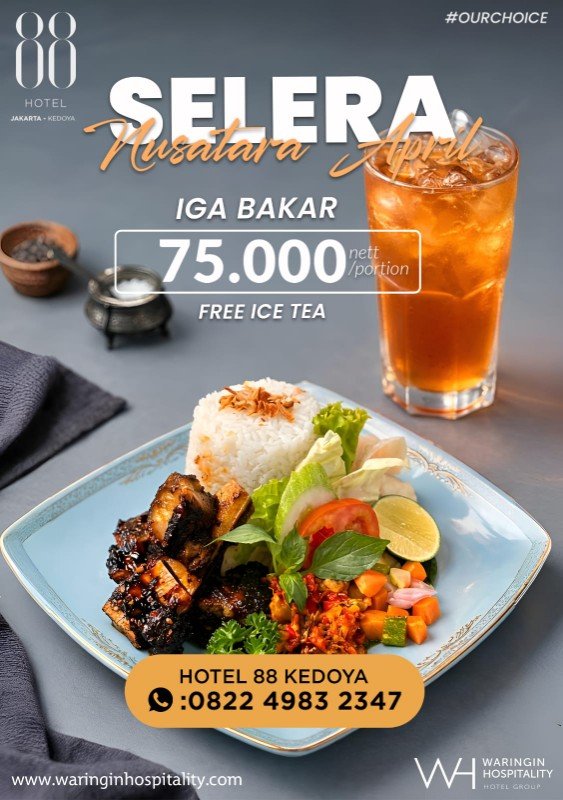 Bagi yang ingin menikmati hidangan lezat tanpa perlu menginap, Hotel 88 Kedoya menawarkan promo kuliner pertama berupa Iga Bakar Spesial dengan harga IDR 75.000 nett per porsi. Hidangan ini menghadirkan cita rasa Nusantara yang otentik, dengan daging iga bakar yang empuk dan bumbu yang meresap sempurna hingga ke dalam serat daging.